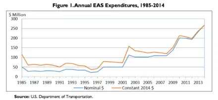 These increases occurred despite numerous Congressional measures to contain program spending.[2] The George W. Bush Administration sought to reduce the cost of the program to $50 million by stricter eligibility criteria and requiring the local governments of the areas served to contribute to the cost. The Heritage Foundation argued in 2014 that rural airports should receive no federal subsidies through the Essential Air Service program; rather, state and local governments that value the air services should support them.[3] The Congressional Research Service has reported in 2018 that since the early 2000s federal subsidies for the EAS have nearly tripled to almost $300 million per year.[2] By March 2021, the subsidies amounted to $339.19 million per year.[4][5]