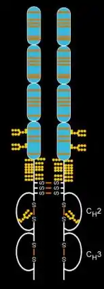 Etanercept is made from the combination of two naturally occurring soluble human 75-kilodalton TNF receptors linked to an Fc portion of an IgG1.[35] The effect is an artificially engineered dimeric fusion protein.[35] Etanercept is a complex molecule containing 6 N-glycans, up to 14 O-glycans and 29 disulfide bridge structures.[36][37][38]