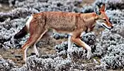 The Ethiopian wolf (Canis simensis),[3] also called the Simien jackal and Simien fox, is a canine native to the Ethiopian Highlands. In southeastern Ethiopia it is also known as the horse jackal. It is similar to the coyote in size and build, and is distinguished by its long and narrow skull, and its red and white fur.[4] Unlike most large canids, which are widespread, generalist feeders, the Ethiopian wolf is a highly specialised feeder of Afroalpine rodents with very specific habitat requirements.[5] It is one of the world's rarest canids, and Africa's most endangered carnivore.[6]