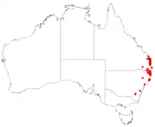 Eucalyptus bancroftii occurs from Maitland and Port Macquarie in New South Wales north to the Tin Can Bay - Boonooroo area in Queensland. It is mainly found in coastal areas but extends to the adjacent tablelands and grows in open forest and woodland, sometimes in low swampy sites but also on rock outcrops on the tablelands.[4][5][10]