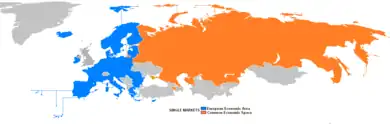 - The Russia – EU Four Common Spaces Initiative, is a joint European Union and Russian agreement to closer integrate Russia and the EU, remove barriers to trade and investment and promote reforms and competitiveness. In 2010, Russian Prime Minister Vladimir Putin called for common economic space, free-trade area or more advanced economic integration, stretching from Lisbon to Vladivostok. However, no significant progress was made and the project was put on hold after Russia-EU relations deteriorated following the Russo-Ukrainian War in 2014.