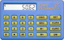 A euro calculator is a type of calculator in European countries (see eurozone) that adopted the euro as their official monetary unit. It functions like any other normal calculator, but it also includes a special function which allows one to convert a value expressed in the previously official unit (the peseta in Spain, for example) to the new value in euros, or vice versa. Its use became very popular within the population and commerce of these countries especially during the first few months after adopting the euro.