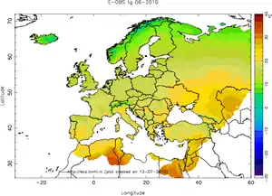 The E–OBS daily gridded dataset is a European land-only, high-resolution gridded observational dataset produced using the ECA&D blended daily station data. The dataset covers the area 25–75N x 40W–75E and comes in two grid flavours with two resolutions: a 0.22° and 0.44° rotated grid (North Pole at 39.25N, 162W) and a 0.25° and 0.50° regular grid. The current version 3.0 was released in April, 2010 and covers 1950–2009. Monthly updates for the current year are available.