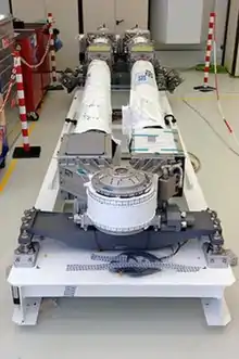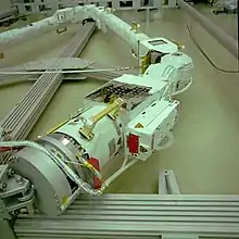 When fully extended the arm has a total length of 11.3 m (37 ft), and can reach 9.7 metres (32 ft) and has 7 degrees of freedom.[4] It has a mass of 630 kilograms (1,390 lb) and can hold a total payload mass of 8,000 kilograms (18,000 lb).[5] The arm's tip can reach a speed of 0.1 metres per second (0.33 ft/s) and has an accuracy of 5 mm (0.20 in). The European Robotics Arm itself was designed to be serviceable with spare parts kept outside Rassvet module and allow for the exchange of large parts via EVA in case of failure or an emergency situation. There parts are called EVA Replaceable Units (ERUs), also referred to as Orbital Replacement Units (ORUs), which can all be replaced in-orbit; the ERA is composed of three ERU sections.[5] The arm is wrapped with beta cloth blankets for thermal protection.[6]