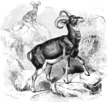 The European mouflon (Ovis aries musimon[1]) is a feral subspecies of the primitive domestic sheep. It was originally found only on the Mediterranean islands of Corsica and Sardinia, but has since been introduced into many other regions of Europe. It is not to be confused with Ovis gmelini, also called the mouflon, which is found in Western Asia and is also ancestral to modern domestic sheep.