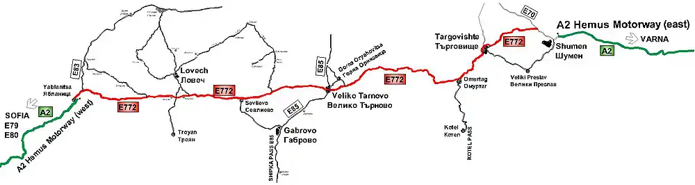 European route E772 is a class B road, part of the International E-road network in Bulgaria. It connects the two sections of the Hemus motorway (A2) constructed so far, and is part of one of the most important transport corridors in the country: from the capital Sofia in the west to Varna and the northern Bulgarian Black Sea Coast in the east.