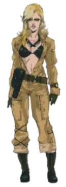 Eva (エヴァ) first appears in Metal Gear Solid 3: Snake Eater, set in 1964, as a motorbike-riding supposed KGB female spy and a former NSA codebreaker who has defected to the Soviets along with ADAM. She uses her charm and good looks to win over the trust of Naked Snake and the Soviet enemies.[2] EVA wants to kill Major Ocelot to avoid revealing her cover but is stopped by Snake. Later, EVA infiltrates Colonel Volgin's GRU base through the disguise Tatyana (タチアナ, Tachiana), Sokolov's supposed lover, and assists Snake;[3] "Tatyana" is tortured by Volgin with electric shocks in order to coerce the uncooperative Sokolov into completing the Shagohod's development and Volgin decided to have her "entertain". Throughout their respective missions, EVA and Snake began to develop romantic feelings for one another, but Snake was initially hesitant. She helps Snake destroy the Shagohod, kill Volgin and reach the Philosophers' Legacy so that she can later steal the treasure, even seeming to fall in love with Snake. At one point, EVA was nearly killed by the Colonel until The Boss volunteered to execute her personally; The Boss was actually trying to get her out of harm's way in reality. After the mission is completed, EVA and Snake have a one-night stand, but she could not bring herself to carry out the order of assassinating Snake, as she promised The Boss she would not. Instead, she flees with what she believes to be the Philosophers' Legacy (which was actually half taken by Ocelot for the CIA) as well as with intelligence data that lead to the breakthrough in the Chinese nuclear weapons program. Snake discovers a tape EVA has left revealing all her secrets. The epilogue prior to the credits goes on to state that EVA disappeared in Hanoi, North Vietnam, during the Vietnam War in 1968.[4]