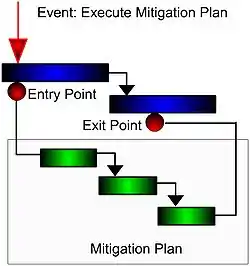 Risk response plans execution are triggered by events, which occur if an activity is in an excited state. Risk response events may attempt to transform the activity from the excited state to the ground state. Response plans are an activity or group of activities (small schedule) that augment the project schedule if a certain event occurs. The solution is to assign the response plan to an event or event chain. The same response plan can be used for one or more events.