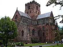 Following his appointment to the Ecclesiastical Commissioners in 1851 Christian began a number of lengthy church restorations. That at the old St Peter's Collegiate Church in Wolverhampton was begun in 1852 and involved the rebuilding of the chancel, completed in the Decorated Gothic style in 1865.[38] Notable were his restorations of Southwell Minster in Nottinghamshire, begun in 1851, and Carlisle Cathedral in Cumberland (1853–1870).[16][39] At Southwell the work went on for 37 years, repairing the walls and masonry and re-roofing the building and Chapter House to the original steeper pitch.[2] The building of the pyramidal spires on the western towers (1881) restored a lost feature to the church: the originals had been destroyed in a fire of 1711 and Christian's work replaced flat roofs of 1802.[40] In 1884 the church was created a cathedral for the new diocese of Nottinghamshire and Derbyshire and its first bishop George Ridding (1828–1904) installed there.[41]