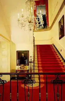 The northern third of what is now the State Dining Room was originally the western part of the Cross Hall. Two flights of stairs (one against the north wall, one against the south wall) led from the State Floor to the Second Floor. A single, central stair then led up to the Third Floor.[66] Not completed when the White House was occupied in 1800, the Grand Stairs were probably finished by architect Benjamin Henry Latrobe in 1803 or shortly thereafter.[66] An extensive chimney breast was added to the fireplace in the room's west wall when it was reconstructed in 1817.[67]