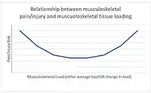 The lifetime prevalence of hip and knee osteoarthritis is 13% for competitive runners, 10% for non-runners, but only 4% for moderate social runners, demonstrating a U-shaped curve between running load and arthritis risk (high and low dose = higher risk; moderate load = lower risk).[39] With respect to back pain, increasing levels of exercise reduce risk of back pain,[40] but having occupational manual loading increases the risk.[41] The bottom of the U-shaped curve for injury risk and loading is sometimes referred to as the Goldilocks zone (not too little exercise but not too much).[42][43][44] There also may be a Goldilocks zone for physical activity and all-cause mortality, but at a very high level and with an eccentric U-shape (that is, low exercise levels are far riskier for all-cause mortality than extremely high exercise levels).[45]