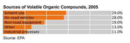 When oxides of nitrogen (NOx) and volatile organic compounds (VOCs) react in the presence of sunlight, ground level ozone is formed, a primary ingredient in smog. A 2005 U.S. EPA report gives road vehicles as the second largest source of VOCs in the U.S. at 26% and 19% are from non road equipment which is mostly gasoline and diesel stations.[15] 27% of VOC emissions are from solvents which are used in the manufacturer of paints and paint thinners and other uses.[16]