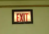 An exit sign is a pictogram or short text in a public facility (such as a building, aircraft, or boat) denoting the location of the closest emergency exit to be used in case of fire or other emergency that requires rapid evacuation. Most relevant codes (fire, building, health, or safety) require exit signs to be permanently lit at all times.