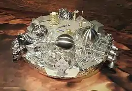 After landing on Mars in June 2023, the rover was intended to descend from the Kazachok lander via a ramp. The lander was expected to image the landing site, monitor the climate, investigate the atmosphere, analyse the radiation environment, study the distribution of any subsurface water at the landing site, and perform geophysical investigations of the internal structure of Mars.[83] Following a March 2015 request for the contribution of scientific instruments for the landing system,[84] there will be 13 instruments.[85] Examples of the instruments on the lander include the HABIT (HabitAbility: Brine, Irradiation and Temperature) package, the METEO meteorological package, the MAIGRET magnetometer, and the LaRa (Lander Radioscience) experiment.