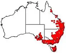 Plants are found in sclerophyll forest, especially in shallow soils,[5][6] and on granite outcrops[2] in eastern Australia. Their extensive habitat range is from Queensland[6] to Victoria,[2] from the coast to the leeward fringe of the Great Dividing Range,[6] and Tasmania.[9] In more southerly parts of South Australia plants are found in a number of isolated pockets of forest including in a band from the Mount Lofty Ranges, down the Fleurieu Peninsula to Kangaroo Island, in the southern parts of the Yorke Peninsula and the Eyre Peninsula and in the Mount Remarkable National Park area.[5][6]