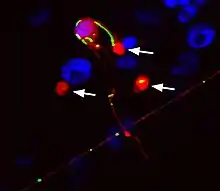 Exophers are a type of membrane-bound extracellular vesicle (EV) that are released by budding out of cells into the extracellular space. Exophers can be released by neurons[1] and muscle[2] in the nematode Caenorhabditis elegans and also from murine cardiomyocytes.[3] Exophers are notable for their large size, averaging approximately four microns in diameter, and they are able to expel whole organelles, such as mitochondria and lysosomes as cargo.[1] An exopher can initially remain attached to the cell that produced it by a membranous filament that resembles a tunneling nanotube. Exophers share similarities with large oncosomes, but they differ in that they are produced by physiologically normal cells instead of aberrant cells associated with tumors.[4]