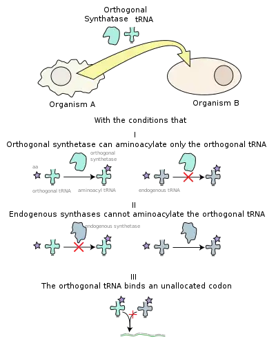 In order to incorporate a novel amino acid into the genetic code several changes are required. First, for successful translation of a novel amino acid, the codon to which the novel amino acid is assigned cannot already code for one of the 20 natural amino acids. Usually a nonsense codon (stop codon) or a four-base codon are used.[6] Second, a novel pair of tRNA and aminoacyl tRNA synthetase are required, these are called the orthogonal set. The orthogonal set must not crosstalk with the endogenous tRNA and synthetase sets, while still being functionally compatible with the ribosome and other components of the translation apparatus. The active site of the synthetase is modified to accept only the novel amino acid. Most often, a library of mutant synthetases is screened for one which charges the tRNA with the desired amino acid. The synthetase is also modified to recognize only the orthogonal tRNA.[6] The tRNA synthetase pair is often engineered in other bacteria or eukaryotic cells.[9]