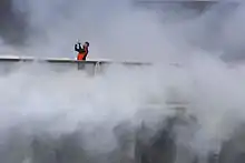 Along the publicly accessible bridge connecting Piers 15 and 17, artist Fujiko Nakaya created an installation called Fog Bridge #72494 that creates bursts of fog for six minutes every half-hour as the first in a series of large-scale temporary installations called Over the Water.[52] The Fog Bridge is 150 feet (46 m) long and makes use of 800 nozzles to create the fog, which Nakaya hopes will inspire visitors to pay attention to the nature of one of San Francisco’s best-known weather patterns. Although originally slated to be temporary, it is now on permanent display. A desalination system, located in Pier 17, conditions bay water for use in the artwork.[53][54]