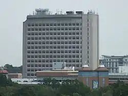 In the foreground is the 73 metre (240 ft) Export House office block built in the centre of Woking. in 1973. It was the headquarters of British American Tobacco and is currently home to the Mouchel Group PLC. It is the town's tallest building.