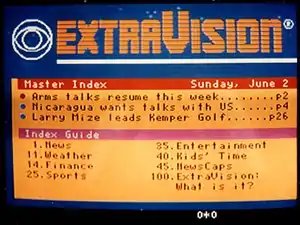 ExtraVision was a short-lived teletext service created and operated by the American television network CBS in the early to mid-1980s.[1][2][3][4] It was carried in the vertical blanking interval of the video from local affiliate stations of the CBS network. It featured CBS program information, news, sports, weather, even subtitling[5] for CBS programming (much like page 888 in British/European teletext, and American closed captioning). ExtraVision could also have its pages customized by the local affiliate station carrying it, for such things as program schedules, local community announcements, and station promotions.