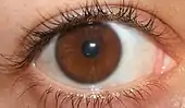 Almost all mammals have brown or darkly-pigmented irises.[24] In humans, brown is by far the most common eye color, with approximately 79% of people in the world having it.[25] Brown eyes result from a relatively high concentration of melanin in the stroma of the iris, which causes light of both shorter and longer wavelengths to be absorbed.[26]