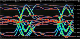 In telecommunication, an eye pattern, also known as an eye diagram, is an oscilloscope display in which a digital signal from a receiver is repetitively sampled and applied to the vertical input (y-axis), while the data rate is used to trigger the horizontal sweep (x-axis). It is so called because, for several types of coding, the pattern looks like a series of eyes between a pair of rails. It is a tool for the evaluation of the combined effects of channel noise, dispersion and intersymbol interference on the performance of a baseband pulse-transmission system. The technique was first used with the WWII SIGSALY secure speech transmission system.