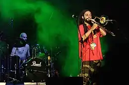 In the spring of 2011, the band reunited in the lineup: Aleksandar Petrović "Alek" (drums), Vladimir Lazić "Laza" (bass), Nemanja Kojić "Kojot" (vocals, trombon), Dušan Petrović (saxophone), Aleksandar Nikić "Lale" (guitar), Zoran Đuroski "Đura" (guitar) and Vukašin Marković (trombon, backing vocals).[4] The reunited Eyesburn had their first performance on 17 June 2011, at Belgrade's SKC, on a concert which was a part of the Jelen Top 10 Tour.[5] On 15 September 2012, Eyesburn performed on Warrior's Dance festival, organized by British group The Prodigy and Exit festival, on Novi Sad's Petrovaradin fortress.[6]