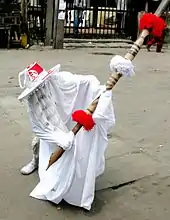 The word "Eyo" also refers to the costumed dancers, known as the masquerades that come out during the festival. The origins of this observance are found in the inner workings of the secret societies of Lagos.[5] Back in the day, the Eyo festival was held to escort the soul of a departed Lagos King or Chief and to usher in a new king. It is widely believed that the play is one of the manifestations of the customary African revelry that serves as the forerunner of the modern carnival in Brazil.[6] On Eyo Day, the main highway in the heart of the city (from the end of Carter Bridge to Tinubu Square) is closed to traffic, allowing for procession from Idumota to the Iga Idunganran palace. The white-clad Eyo masquerades represent the spirits of the dead, and are referred to in Yoruba as "agogoro Eyo" (literally: "tall Eyo").[7]