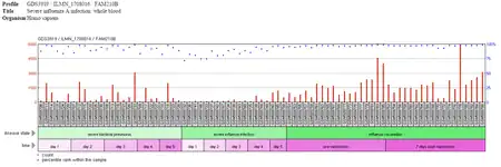 The following image contains the gene expression of FAM210B in patients with severe bacterial pneumonia, severe influenza, and those who received the influenza vaccine. As seen in the image, FAM210B is lower in rank in the patients with severe bacterial pneumonia and are even lower in those with severe influenza, as compared to those who received the influenza vaccine.[18]