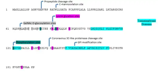 The following conceptual translation presents expected post-translational modifications. The modifications were predicted by MotifScan, and then searched in greater detail in Expasy[10] Modifications found include propeptide cleavage sites, C-mannosylation sites, GalNAc O-glycosylation sites, lysine glycation sites, phosphorylation sites, a Coronavirus 3C-like proteinase cleavage site, and a GPI modification site.