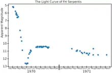 FH Serpentis (Nova Serpentis 1970) was a nova, which appeared in the constellation Serpens in 1970. It reached magnitude 4.4.[5] It was discovered on February 13, 1970 by Minoru Honda located at Kurashiki, Japan.[6][7] Other astronomers later studied this nova, and calculated its distances based on the decay time of its light curves.[7]