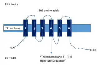 In mammals, FITM2 protein is made up of 262 amino acids (while FIT1 part of the same family is 292 amino acids long) and has six transmembrane domains in which the N and C termini are both geared to face the cytosol.[3] When FITM2 has a mutation in its fourth transmembrane domain that happens to be a gain-of-function one, is found overexpressed in cells, it has unfailingly caused the buildup of TG rich lipid droplets. This mutation has been described as having a significant effect on increasing both the amount and size and lipid droplets.[4] A comparative sequence analysis of FITM2 showed a tract of residues that were deemed as extensively conserved located in this transmembrane 4 that was later named the “FIT signature sequence”.[9]