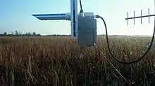 This sensor works because Infrared light is absorbed by a variety of gases at different wavelengths within the spectrum including methane, carbon monoxide, carbon dioxide and oxygen. To measure the concentration, a beam of light is emitted into the air sample. By measuring the difference between the input and output of the infrared beam, the sensor can determine the amount of the trace gases in the sample.[5] It is common for an infrared gas analyzer to have two configurations. The "open design" operates by shooting a beam of infrared light through the air outside of the sensor body. Meanwhile, the closed design works by sucking air into the sensor body measuring the concentration of trace gases inside of a sealed chamber. Usually, open sensors are placed within half a meter of the anemometer while closed sensors use a collection tube mounted inside the anemometer to get their air sample.[1]