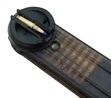 The P90 uses a unique horizontally mounted feeding system—patented in the United States—that contributes to the weapon's compact profile and unusual appearance.[10] U.S. Patent 4,905,394 ("Top mounted longitudinal magazine") was awarded in 1990, naming René Predazzer as the sole inventor.[32] The detachable box magazine is mounted parallel to the P90's barrel, fitting flush with the top of the weapon's frame, and it contains 50 rounds of ammunition which lie in two rows facing left, offset 90° from the bore axis.[17] As the cartridges are pushed back by spring pressure and arrive at the rear end of the magazine, they are fed as a single row into a spiral feed ramp and rotated 90 degrees, aligning them with the chamber.[17] The magazine body is composed of polymer, and it is translucent to allow the shooter to see the amount of ammunition remaining at any time.[17]