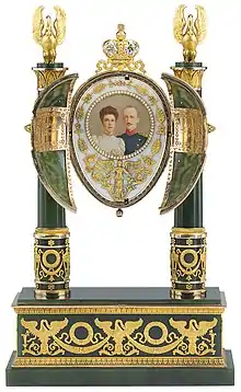 | 1916 | Order of St. George | ![]() | Made during World War I, the Order of St. George egg commemorates the Order of St. George that was awarded to Emperor Nicholas and his son, the Grand Duke Alexei Nikolaievich.[25] The Order of St. George Egg and its counterpart, the Steel Military Egg, were of modest design, in keeping with the austerity of World War I,[26] and Fabergé billed 13,347 rubles for the two.[25] The Order of St. George egg left Bolshevik Russia with its original recipient, the Dowager Empress Maria Feodorovna.[27] | Viktor Vekselberg |