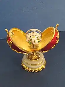 | 1887 | Third Imperial | ![]() | A jewelled and ridged yellow-gold egg with Vacheron & Constantin watch stands on its original tripod pedestal, which has chased lion paw feet and is encircled by coloured gold garlands suspended from cabochon blue sapphires topped with rose diamond set bows. After being discovered in an American flea market, in 2014 it was purchased by London-based jeweller Wartski on behalf of an unidentified private collector.[17] | Private collection[18] |
