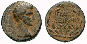 Tetradrachm of Gaius Fabius Hadrianus, as proconsul at Pergamon (with the local magistrate Demeas), circa 57 BC. On the obverse is a Cista mystica within ivy wreath; on the reverse is a bow case between two serpents, with a thyrsus on the right.