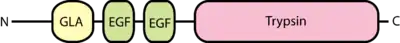 Factors VII, IX, and X all play key roles in blood coagulation and also share a common domain architecture.[10] The factor IX protein is composed of four protein domains: the Gla domain, two tandem copies of the EGF domain and a C-terminal trypsin-like peptidase domain which carries out the catalytic cleavage.