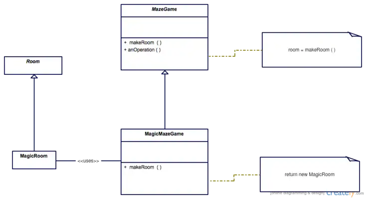 Room is the base class for a final product (MagicRoom or OrdinaryRoom). MazeGame declares the abstract factory method to produce such a base product. MagicRoom and OrdinaryRoom are subclasses of the base product implementing the final product. MagicMazeGame and OrdinaryMazeGame are subclasses of MazeGame implementing the factory method producing the final products. Thus factory methods decouple callers (MazeGame) from the implementation of the concrete classes. This makes the "new" Operator redundant, allows adherence to the Open/closed principle and makes the final product more flexible in the event of change.