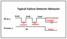 Chandra and Toueg, the co-authors of the book Unreliable Failure Detectors for Reliable Distributed Systems (1996), approached the concept of detecting failure nodes by introducing the unreliable failure detector.[6] They describe the behavior of a unreliable failure detector in a distributed computing system as: after each process in the system entered a local failure detector component, each local component will examine a portion of all processes within the system.[5] In addition, each process must also contain programs that are currently suspected by failure detectors.[5]