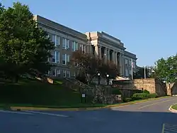 Fairmont Normal School Administration Building is a historic school building located on the campus of Fairmont State University at Fairmont, Marion County, West Virginia. It was built between 1915 and 1917, and is a large three-story Classical Revival style building sited atop a hill overlooking Locust Avenue. Its light coated brick exterior walls are ornamented with limestone and terra cotta details. Its front features a portico with eight Ionic order columns with shafts made of Indiana Blue Limestone. The original building measured 265 feet by 65 feet; the west wing was added in 1927.[2]