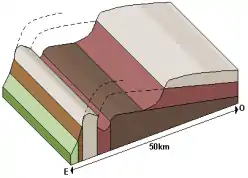 About 400 million years ago the land that became the Falkland Islands and Antarctica's Ellsworth Mountains, which had been part of Gondwana, broke from what is now Africa and drifted westwards relative to Africa.[1] During the mid-Jurassic period[2] (about 170 million years ago) the land fragment that was to become East Falkland and the land fragment that was to become West Falkland rotated about 120° relative to each other. As a result, the fold lines in West Falkland run almost south-west to north-east, parallel to the Sound. Those in the northern part of East Falkland run east-west, forming the eastern part of northern entrance to the Sound and bordering on the northern banks of San Carlos Water. The boundary between these two land fragments, the Falkland Sound Fault, lies close to and parallel with the western shore of the Sound. Lafonia (the southern half of East Falkland), which is a much newer formation, has no folds.