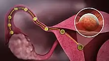 After ovulation, the egg (oocyte) passes from the ovary (left) through the fallopian tube to the uterus (right).