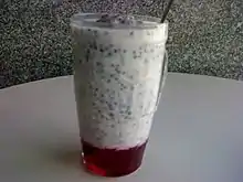 A falooda is a Mughlai cuisine version of a cold dessert made with noodles.[1][2] It has origins in the Persian dish faloodeh, variants of which are found across West, Central, and South Asia.[3] Traditionally it is made by mixing rose syrup, vermicelli, and sweet basil seeds with milk, often served with ice cream.[4] The vermicelli used for preparing falooda is made from wheat,[5] arrowroot, cornstarch, or sago.[6]