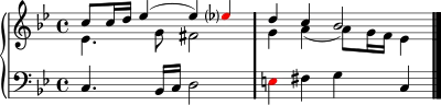 In this instance, the false relation is less pronounced: the contradicting E♭ (soprano voice) and E♮ (bass voice) (diminished octave) do not sound simultaneously. Here the false relation occurs because the top voice is descending in a minor key, and therefore takes the notes of the natural minor scale descending (the diatonic sixth degree). The bass voice ascends and therefore makes use of the ascending melodic minor scale (the raised sixth degree).