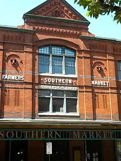 Farmer's Southern Market is a historic farmer's market located in downtown Lancaster, Lancaster County, Pennsylvania. It was designed by noted Lancaster architect C. Emlen Urban and built in 1888. It is a brick building consisting of a three-story headhouse and two-story markethouse, in the Queen Anne style. It measures 90 feet wide (7 bays) and 250 feet deep. It features ornamental terra cotta and brickwork and towers.[2] The city closed the market in the late 1980s, and has since housed Lancaster's Visitors Bureau, offices and Council Chambers.