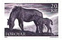 The Faroe pony, Faeroes pony, or Faroese horse,[1] (Føroyska rossið in Faroese) is a small pony, with a height between 11.1 to 12.1 hands (45 to 49 inches, 114 to 124 cm). Technically this animal is a pony due to its height, but in the Faroe Islands it is called a horse because of its strength. The Faroe pony is only to be seen on the Faroe Islands and is therefore little known in other countries. There are only 94 Faroe ponies left living on the Faroe Islands.[2]