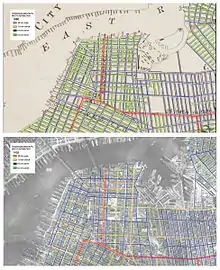 In contrast to other places, subway service to the Farragut Houses area has declined over the decades.[24][25][26] In the late 19th and early 20th centuries, the neighborhood was served by elevated lines and trolleys.[27][28] The first elevated railway, the BMT Myrtle Avenue Line, came to downtown Brooklyn in 1885 and ran only a few blocks away.[29] The N, R, and W trains' station at Lawrence Street (now Jay Street–MetroTech) opened on June 11, 1924.[30] High Street opened on June 24, 1933,[31] and York Street on April 9, 1936.[32] A trolley ran on Sands, Jay, and Hudson Streets, very close to the site of Farragut Houses, although the last trolley cars were retired on March 4, 1951, the same year the Farragut Houses opened, and the last trolley bus ran on Flushing Avenue to High Street on July 27, 1960.[33] As late as 1951 the Myrtle Avenue El still existed, stopping at Navy Street and Myrtle Avenue, about three blocks from the current site of the Farragut Houses, as it had since the 1880s.[34]