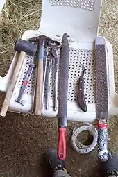| Hammer | Two types, a larger design used on the anvil to shape shoes, a smaller one used to drive nails into hoof wall, through nail holes in shoe | |