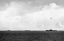 The ships of each task group sailed in a circle formation centered on the carriers. The supporting ships sailed relatively close by, and added their anti-aircraft fire to that of the carriers to help ward off attacking aircraft. When under attack by torpedo aircraft, the task group would turn toward the oncoming aircraft to limit attack angles.[4] Other than this measure, the carriers in the task group would not take evasive action from their attackers. This was in marked contrast with the Imperial Japanese Navy, but the choice made for more stable platforms for the anti-aircraft fire of all the ships in the task group and allowed the ships in the group to sail more closely together. The primary defense of the group against air attack was the group's own fighter cover.